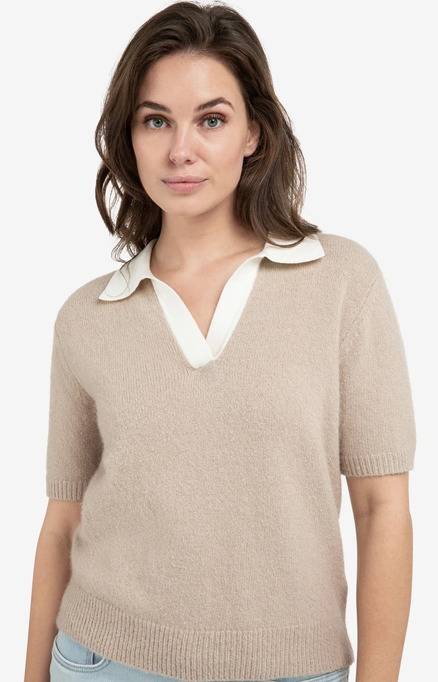 This soft, finely knitted sweater features short sleeves, a regular fit, and a contrasting polo collar with a deep V-neckline. The combination of refined knitwear and sporty details creates a modern, casual look. Finished with ribbed trims at the sleeves and hem.