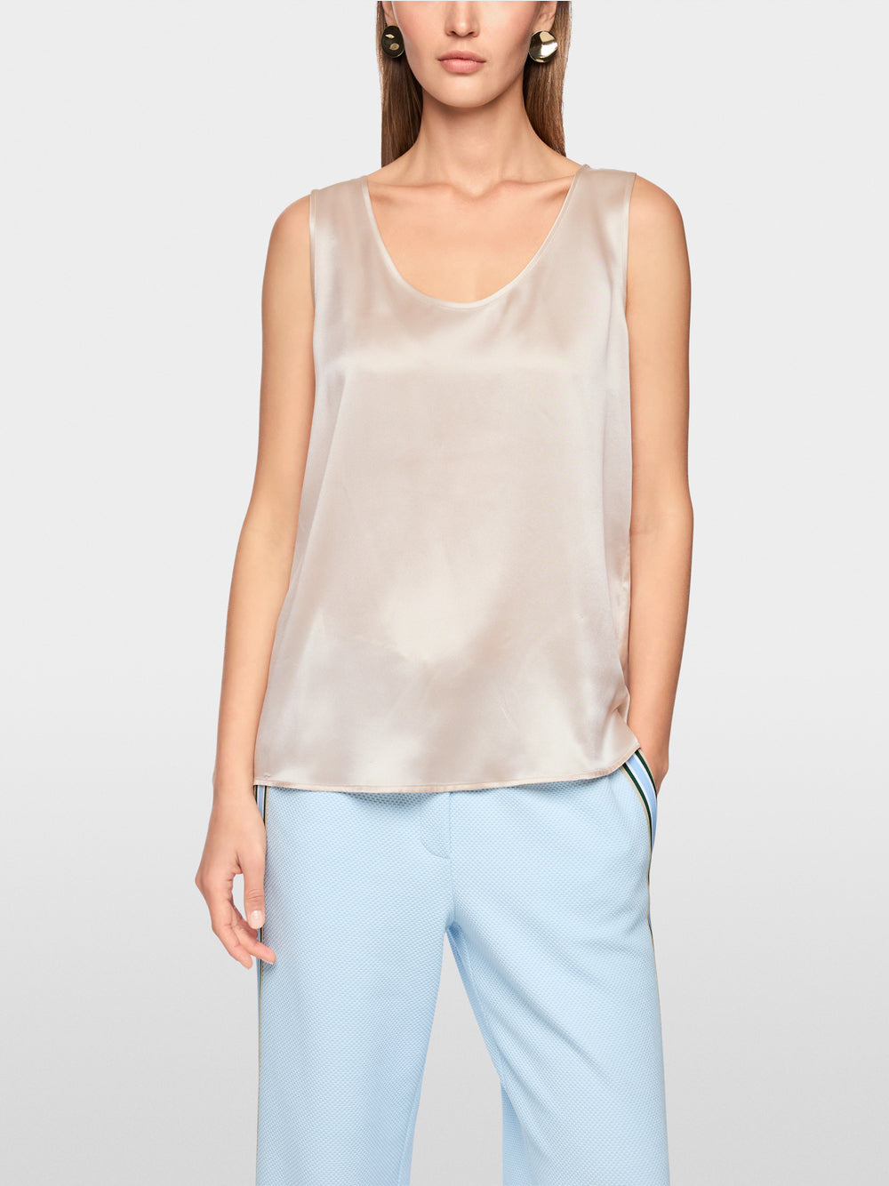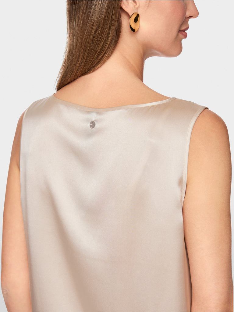 This elegant top, crafted from 100% pure silk, impresses with its relaxed fit and fluid, cool touch. The round neckline lends the design timeless sophistication, making it a versatile essential for the office, leisure, or evening occasions. Light yet luxurious, the silk top offers exceptional comfort while enhancing a stylish, modern look.