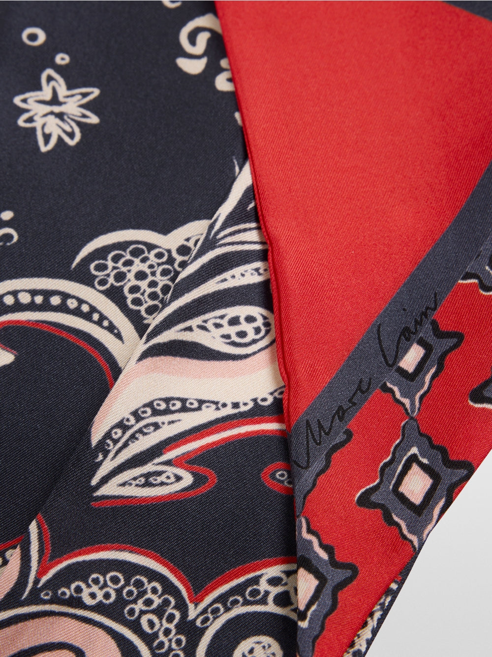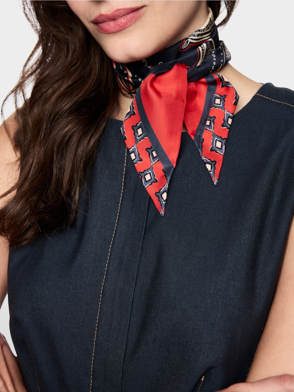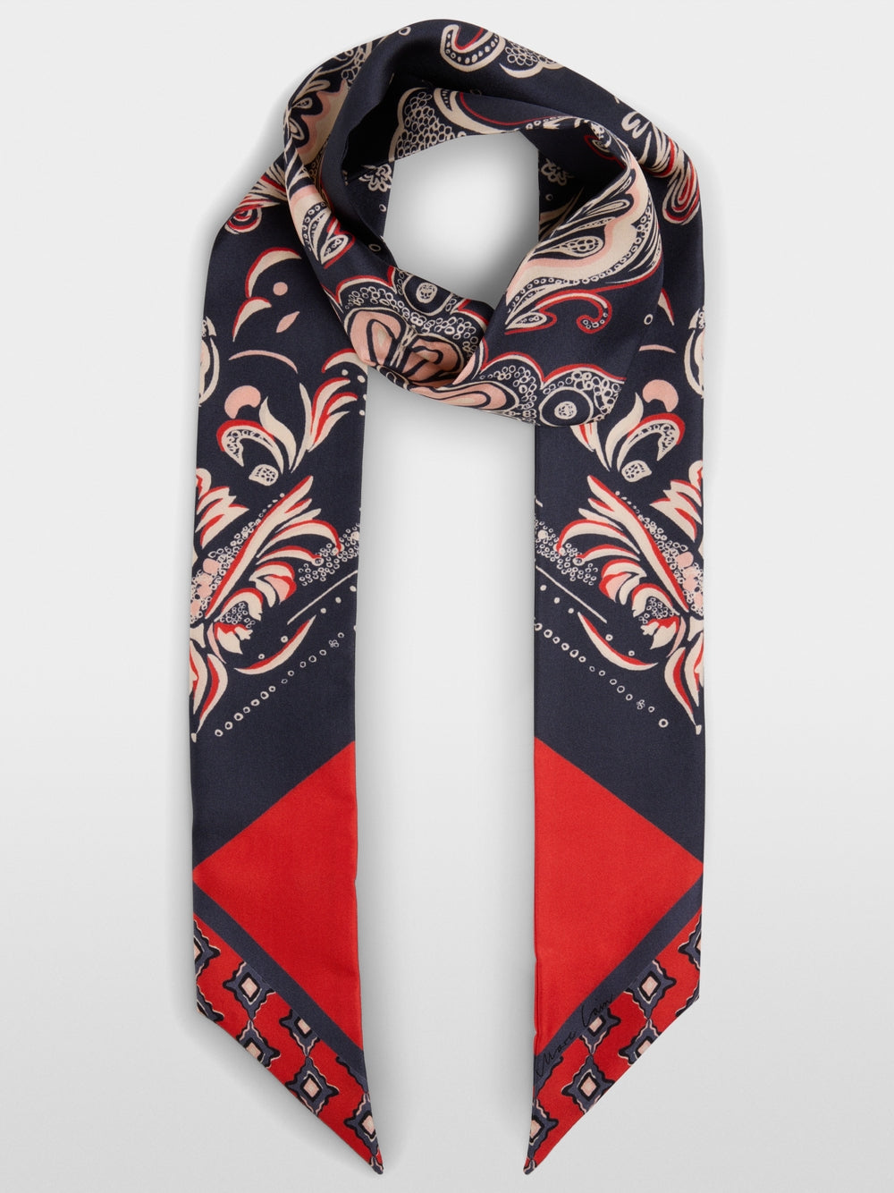 Elegant scarf made from 100% silk with a sophisticated pattern mix of diamonds and paisley details. The scarf's narrow, elongated shape makes it versatile – whether worn classically around the neck or as a stylish accessory on a bag.