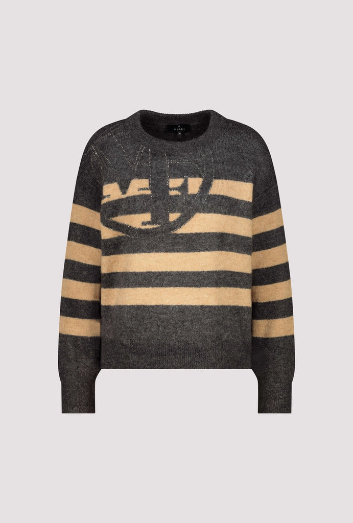 An elegant sweater made of flowing viscose with a striped pattern, adorned with rhinestones and an intarsia pattern—a must-have!