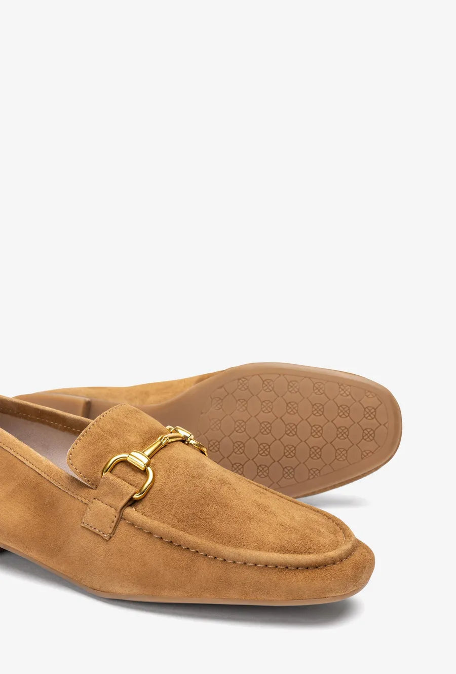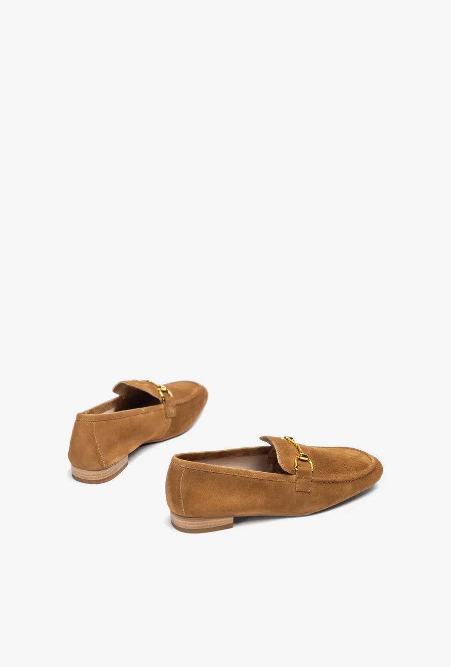 Square toe loafer made in suede. Metal trim over the vamp. Soft lining and extra padding in the entire sole for your comfort. Low painted faux wood heel. Light, flexible, non-slip rubber sole. An ideal, versatile and timeless accessory to enhance your daily looks with a feminine and elegant touch.