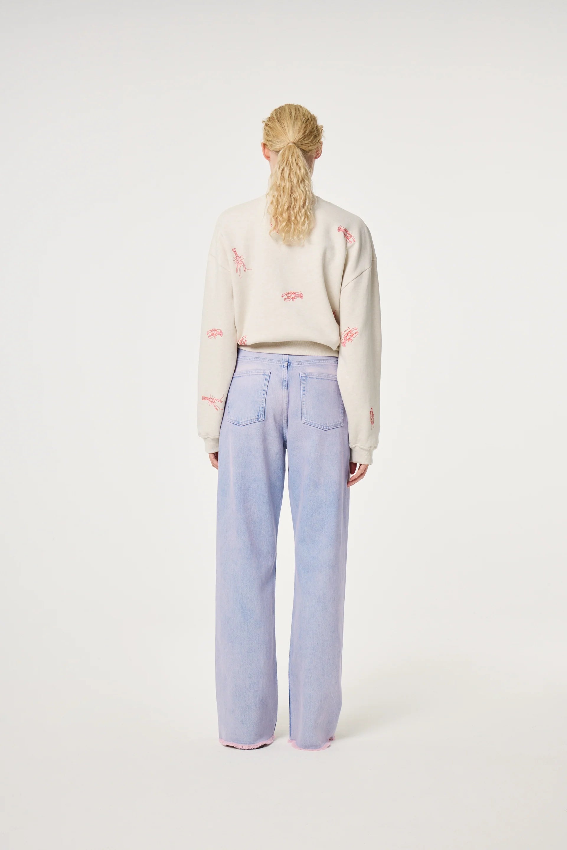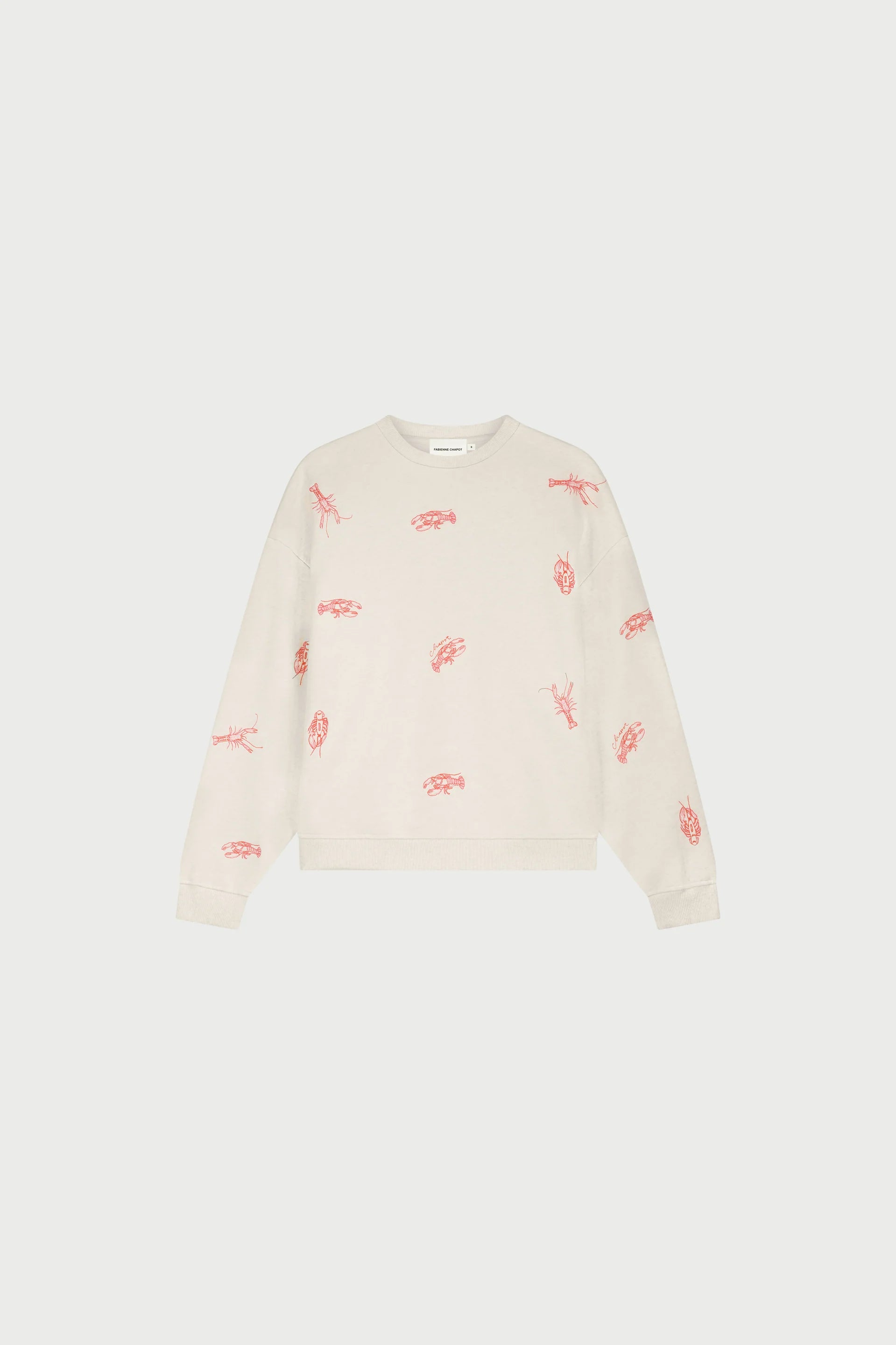 This beige sweater is crafted from 100% organic cotton for a soft, breathable feel. Featuring a playful lobster print all over, it offers a relaxed, loose fit for effortless comfort. Perfect for casual days, weekend outings, or adding a whimsical touch to your wardrobe.