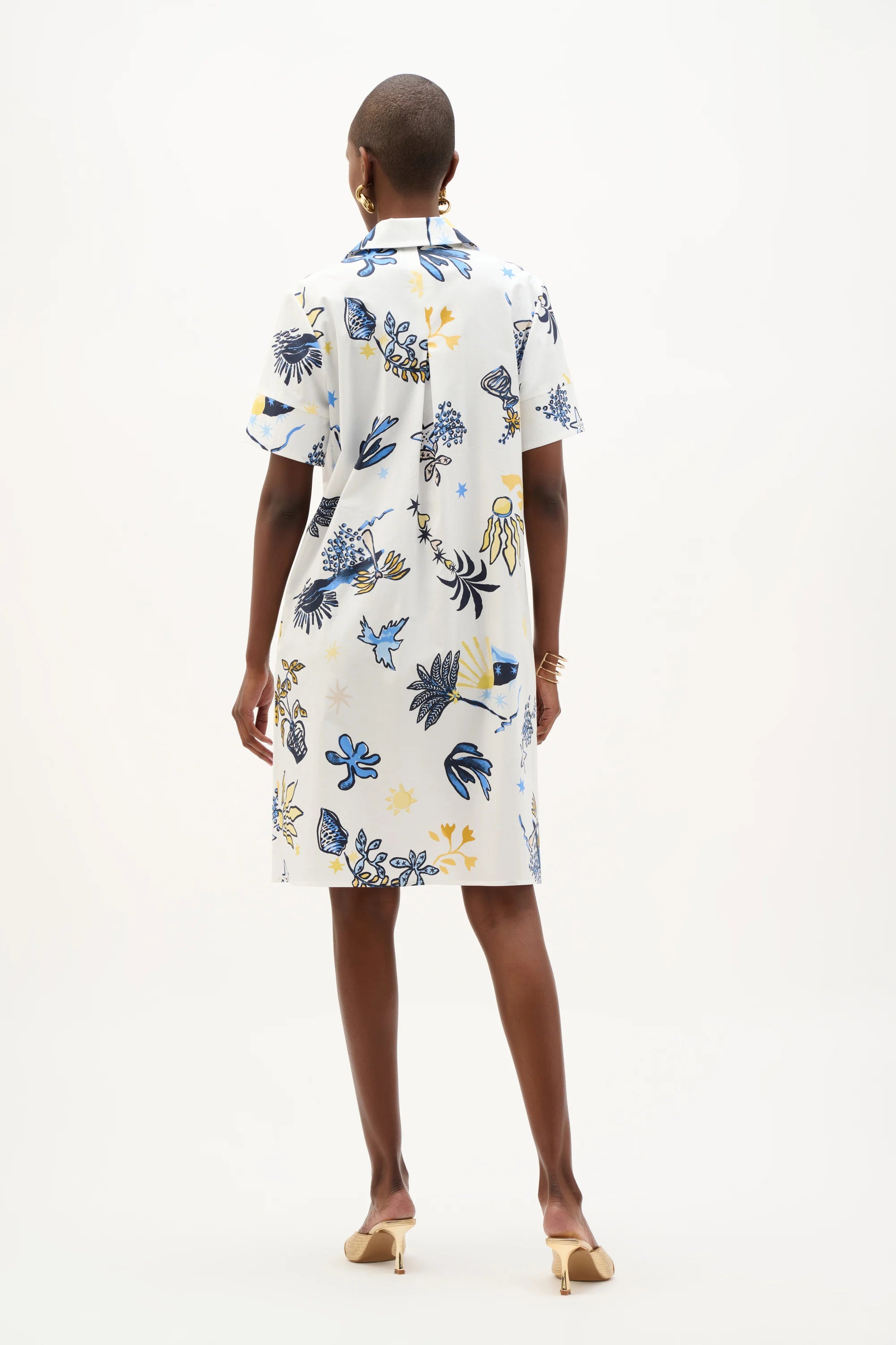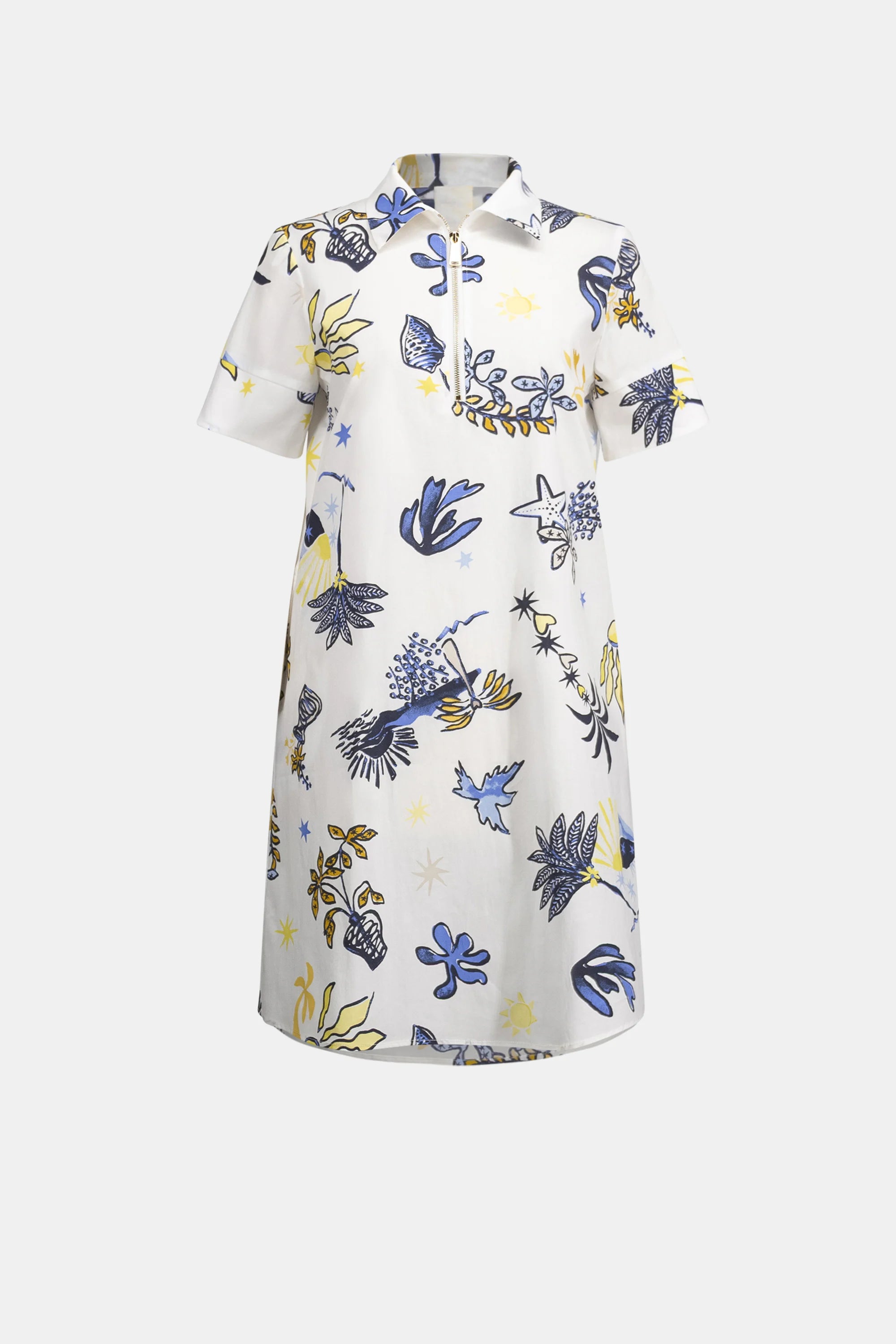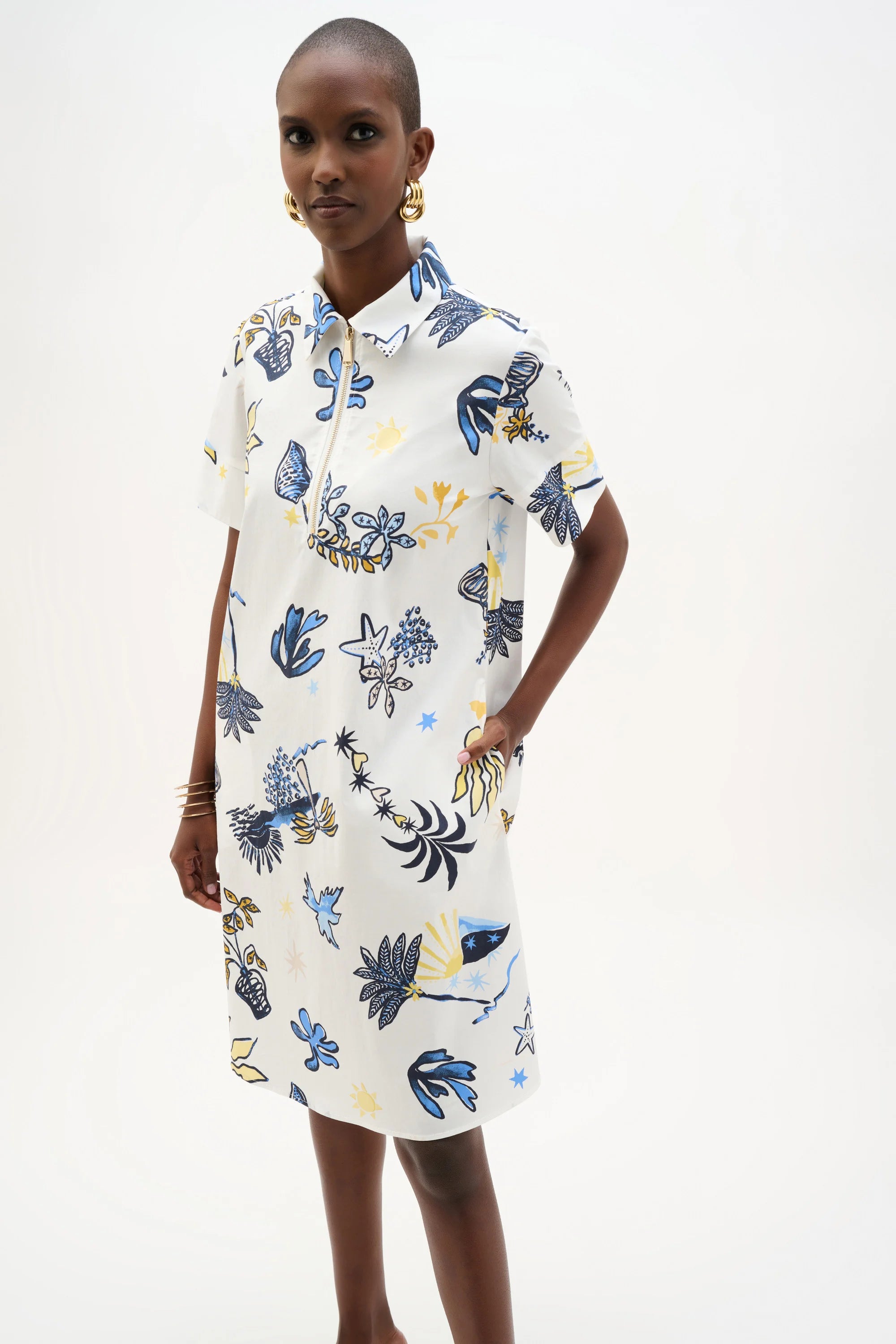 This tropical print stretch cotton A-line dress features a shirt collar and a front metal zipper for a modern twist. Short cuffed sleeves and side pockets add ease to the knee-length silhouette.