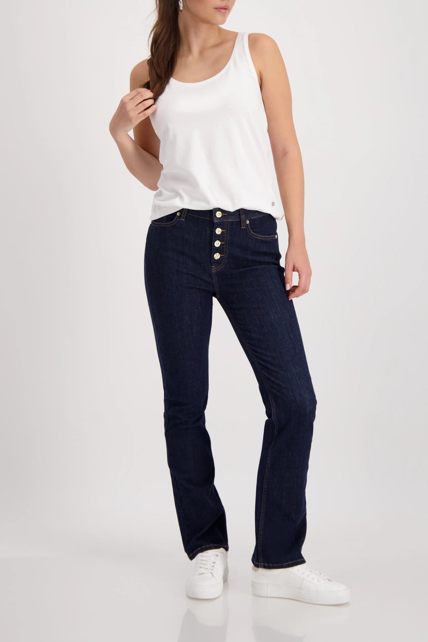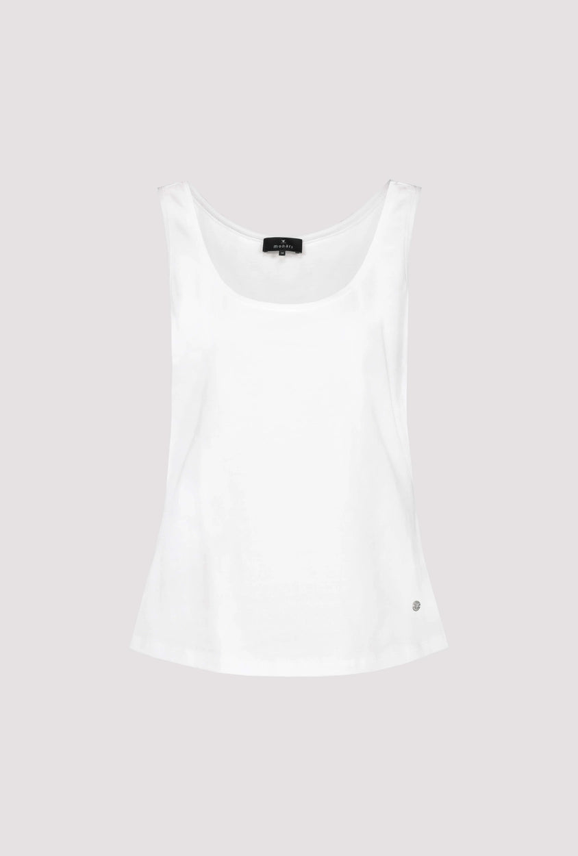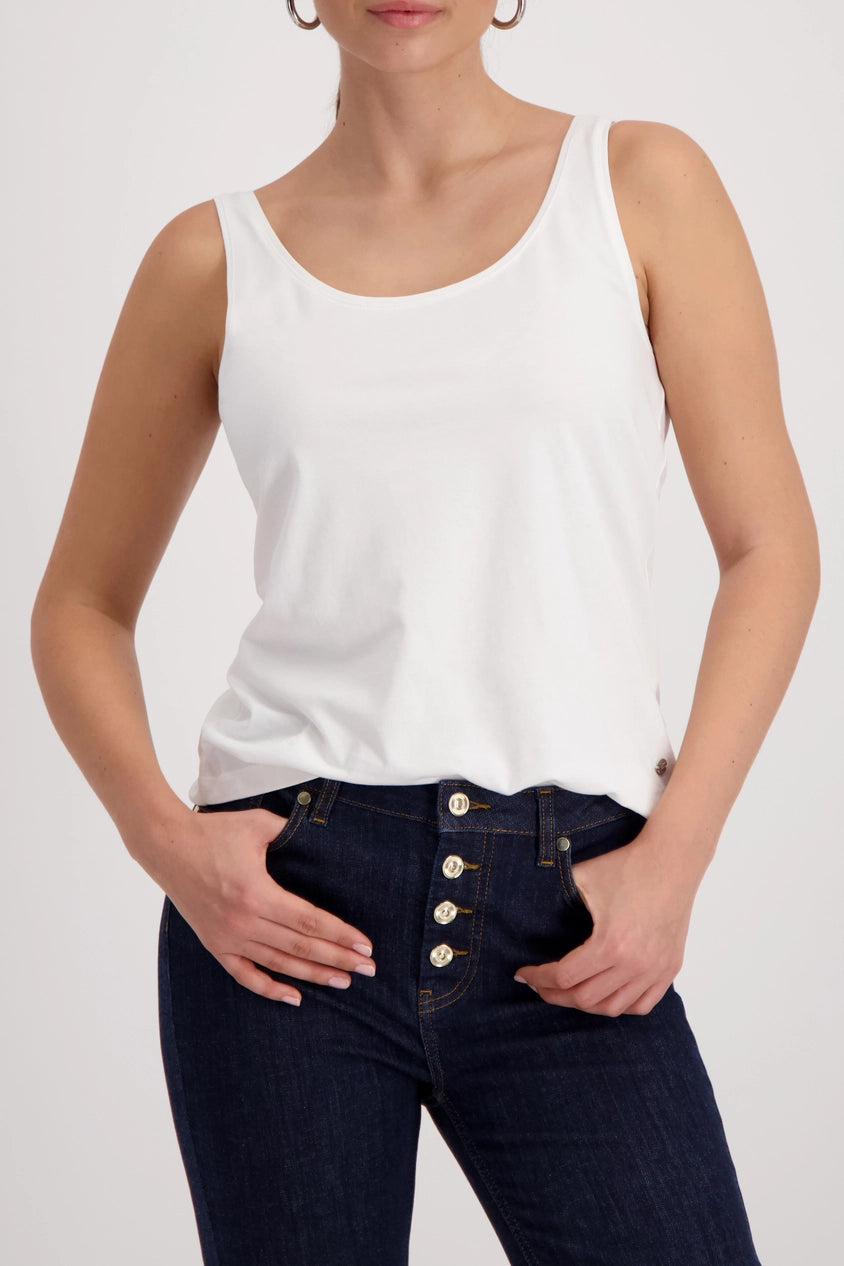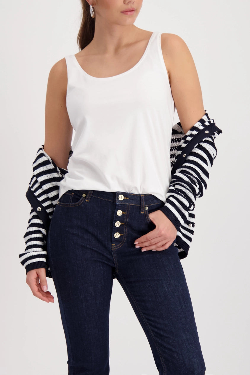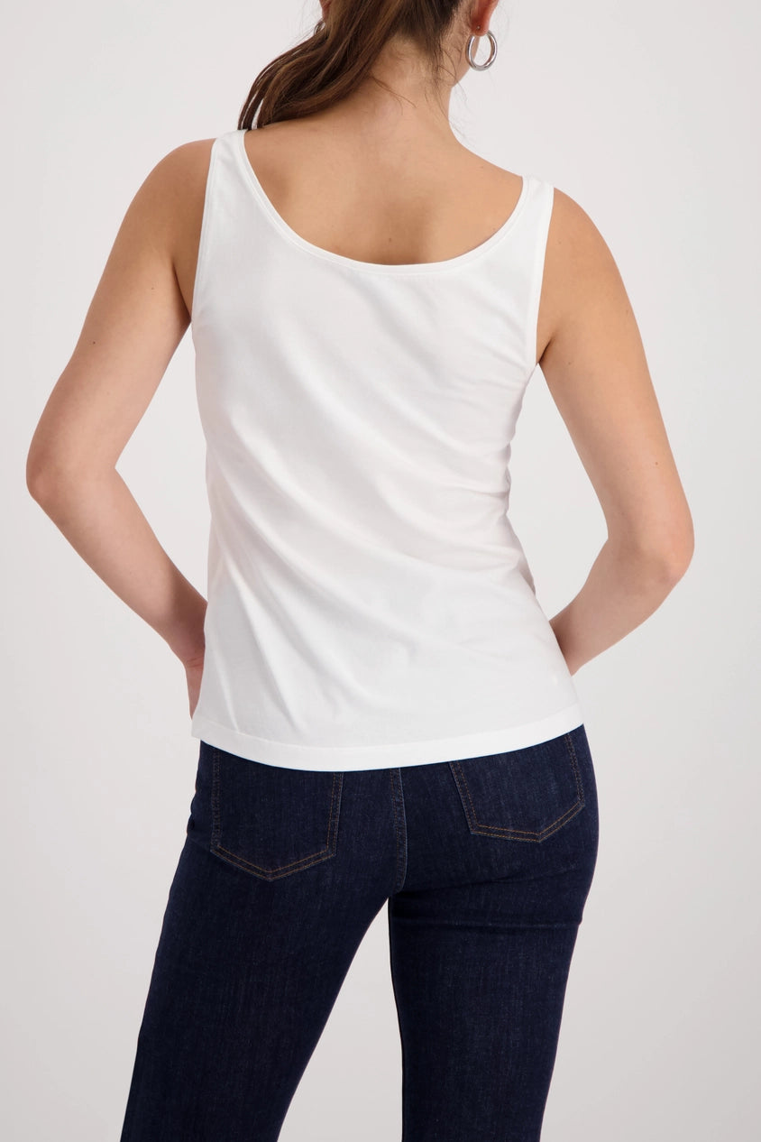 This basic top is slightly fitted and features wide straps and a rounded hem.